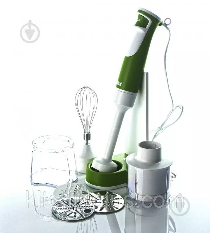 К нижней части ручного блендера DSP крепятся три рабочие поверхности: насадка-блендер для смешивания и измельчения; венчик, предназначенный для взбивания жидких смесей; чоппер со стальным двухлопастным ножом и крышкой, для измельчения твердых продуктов. Пластиковая «юбка» насадки-блендера защищает нож от ударов о края посуды.