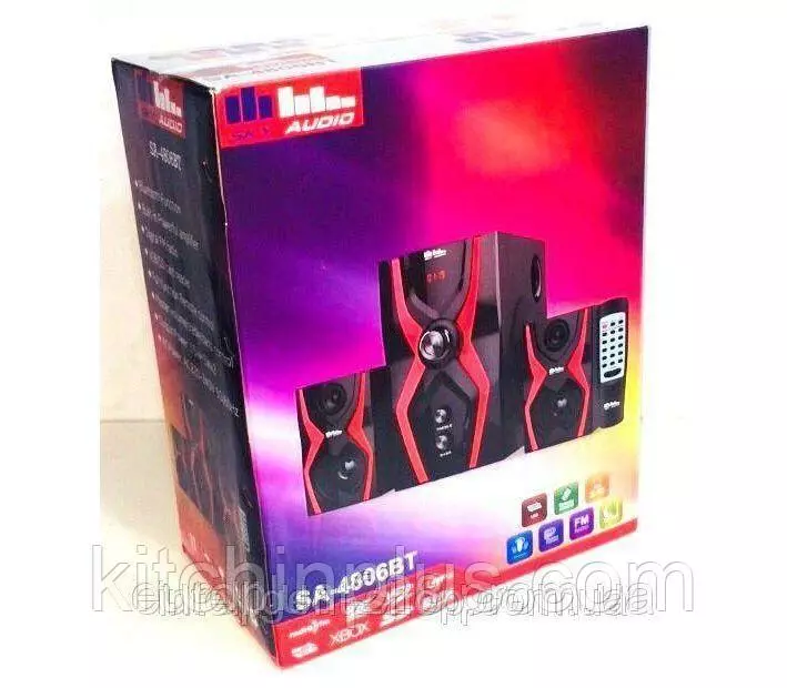 Акустическая система Sky Audio, SA-4806BT, Bluetooth – акустика из 2 колонок и сабвуфера со встроенным медиапроигрывателем. Акустическую систему можно подключать к компьютеру, планшету, телефону или другому источнику звука. Sky Audio является самостоятельным музыкальным центром - она может проигрывать файлы с USB флешки, с карты памяти SD и имеет встроенный FM тюнер, есть пульт ДУ. Корпуса сателлитов представляют собой закрытые ящики. Колонки-сателлиты компактные, их можно без проблем разместить на столе, крепление настенное не предусмотрено. Сабвуфер прямоугольной формы. На передней панели расположен дисплей и кнопки управления медиаплеера - пауза/воспроизведение, переключение треков, переключение между источниками сигнала, переключение радиостанций. Две большие круглые ручки регулируют громкость (верхняя) и уровень низких частот (нижняя). Внизу расположены слоты USB и SD. Звук достаточно высокого качества, хорошая стереопанорама, бас достаточно быстрый, в кашу не сливается, низкие частоты не забивают все остальные диапазоны. Наблюдается хорошая динамика звука. Неплохое звучание сателлитов в средне частотной области, а также сбалансированное звучание сателлитов и сабвуфера.