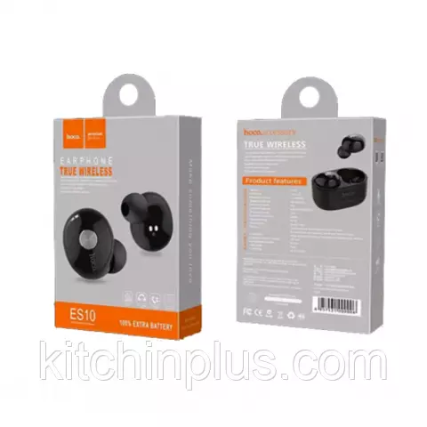 В комплекте поставляется пара наушников Hoco ES10, портативный бокс для зарядки наушников, кабель для зарядки, 4 сменные мембраны разного размера, документация.