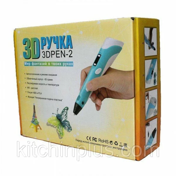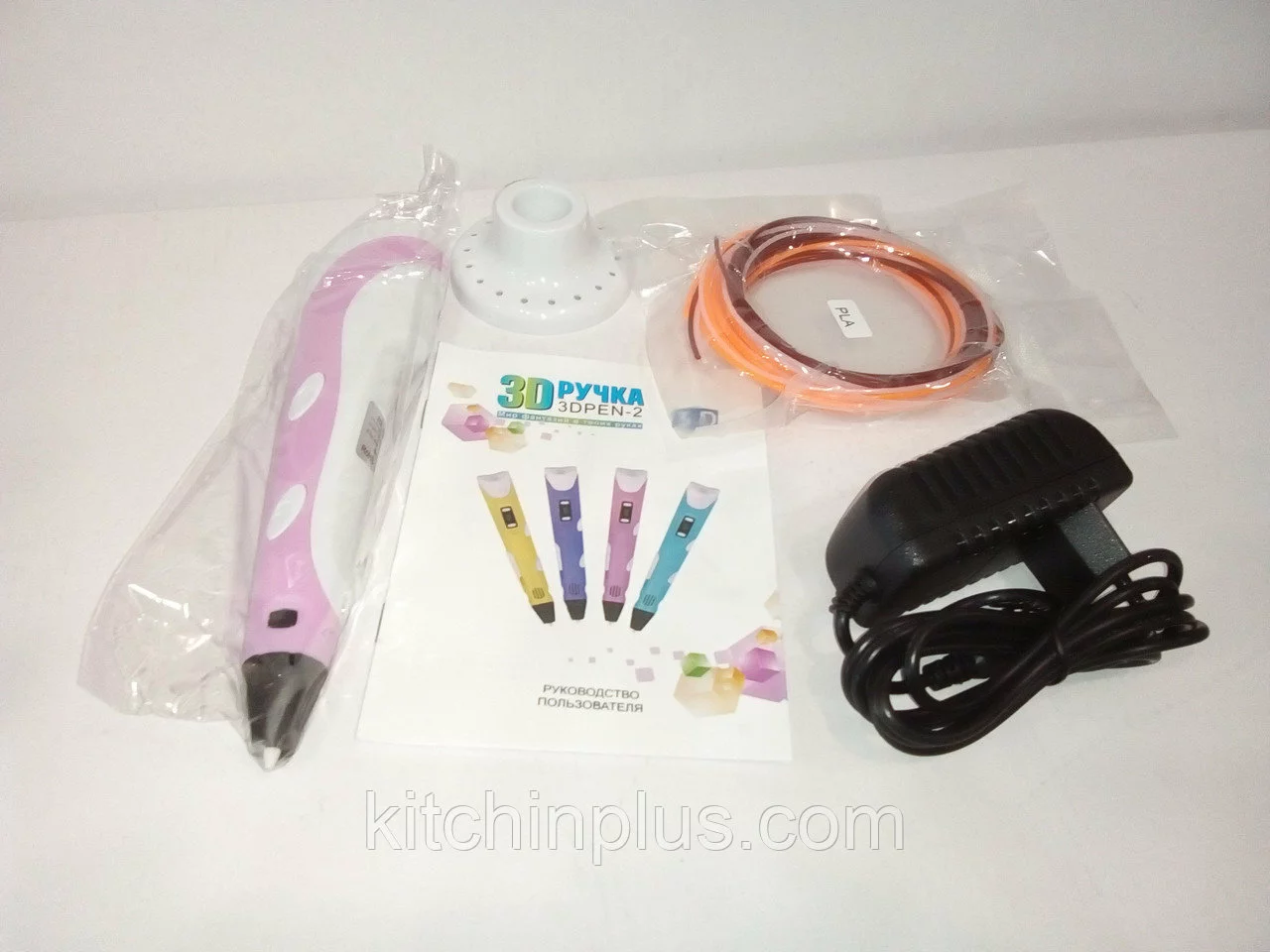 В комплект входит: ручка, адаптер, 4 цвета пластика ABS, инструкция.