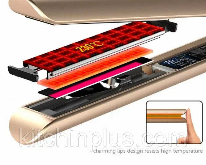 Материал поверхности рабочих пластин - керамика, что влияет не только на конечный результат прически, но и на здоровье волос. Такой вид пластин наносит наименьший вред, быстро и равномерно нагреваются, легко скользят по волосам и предотвращают электризацию. Утюжок способен нагреваться от 120 до 230 °С.